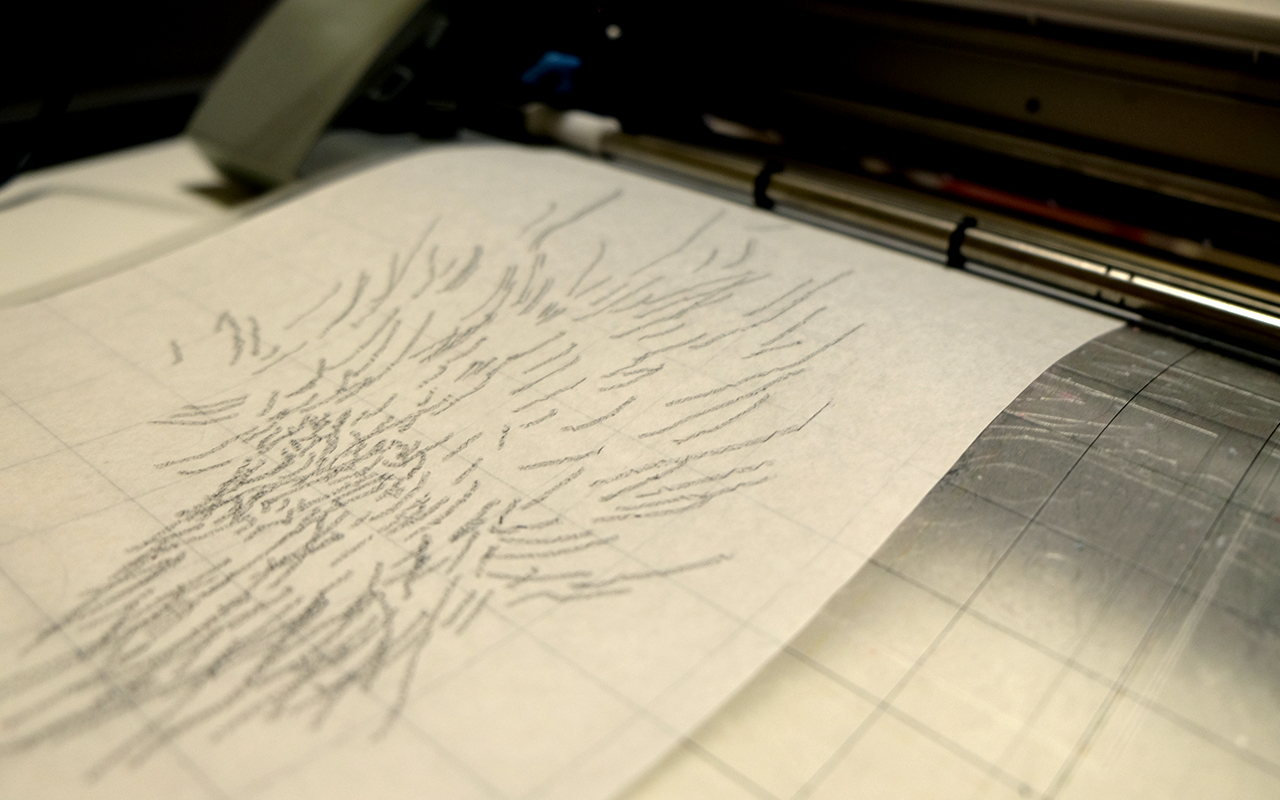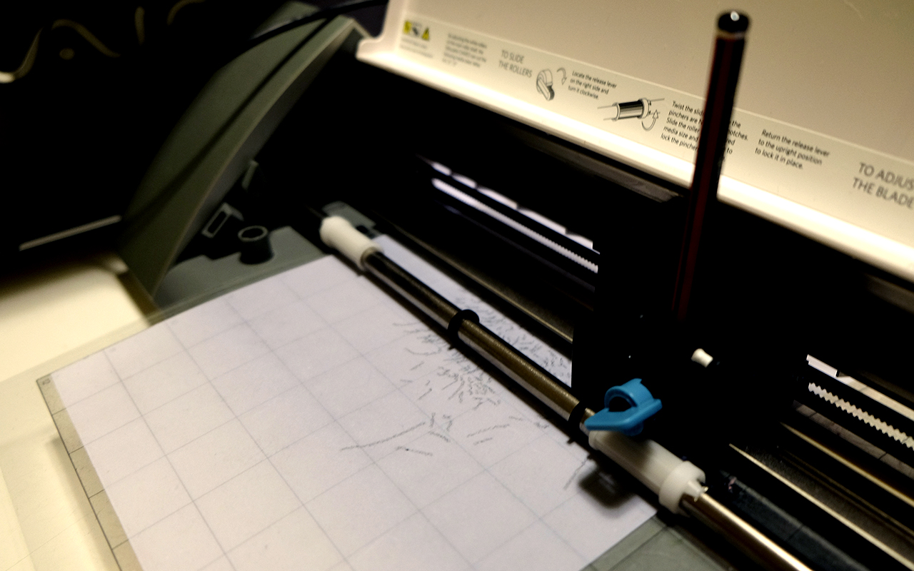 A impressora de corte é adaptada com o ajuste do lápis no lugar original da lâmina de recorte. Ao lado, a immpressora em funcionamento desenhando sobre papel translúcido. O lápis correndo em um eixo horizontal e o papel na perpendicular.