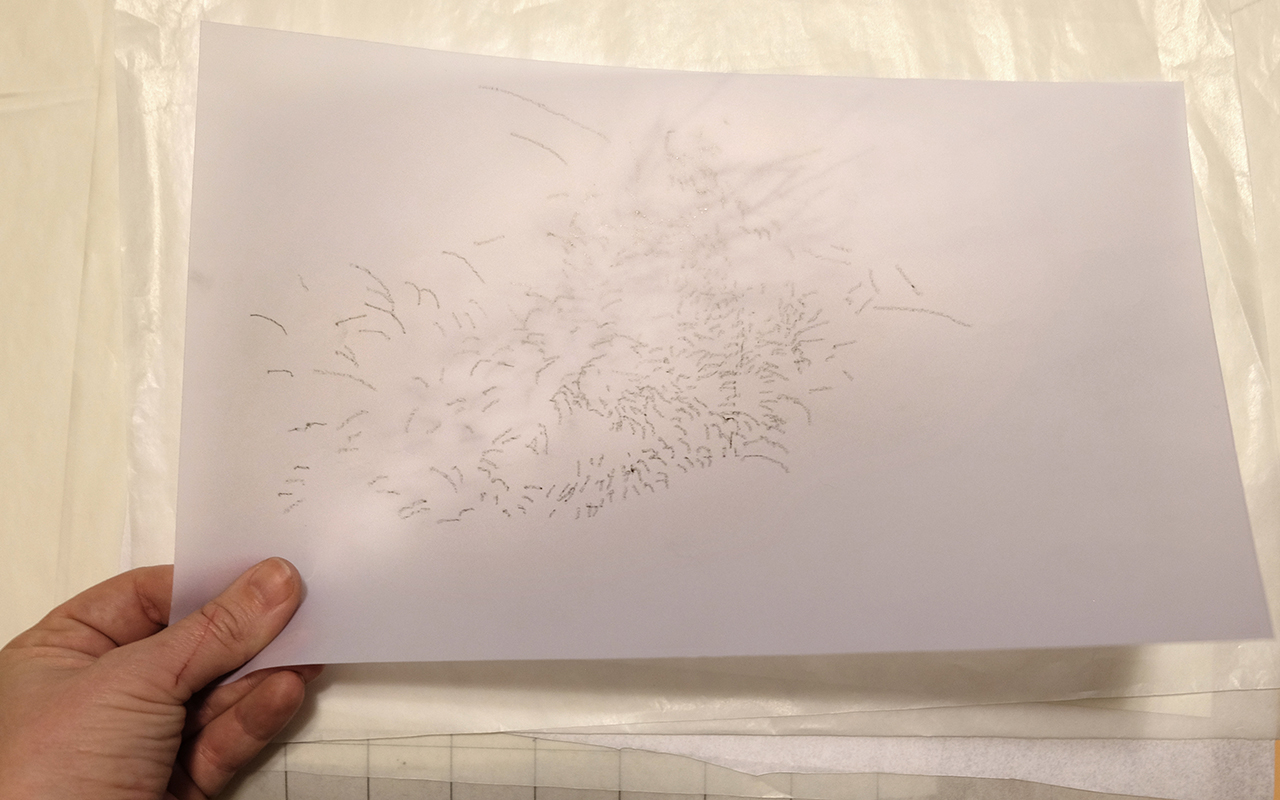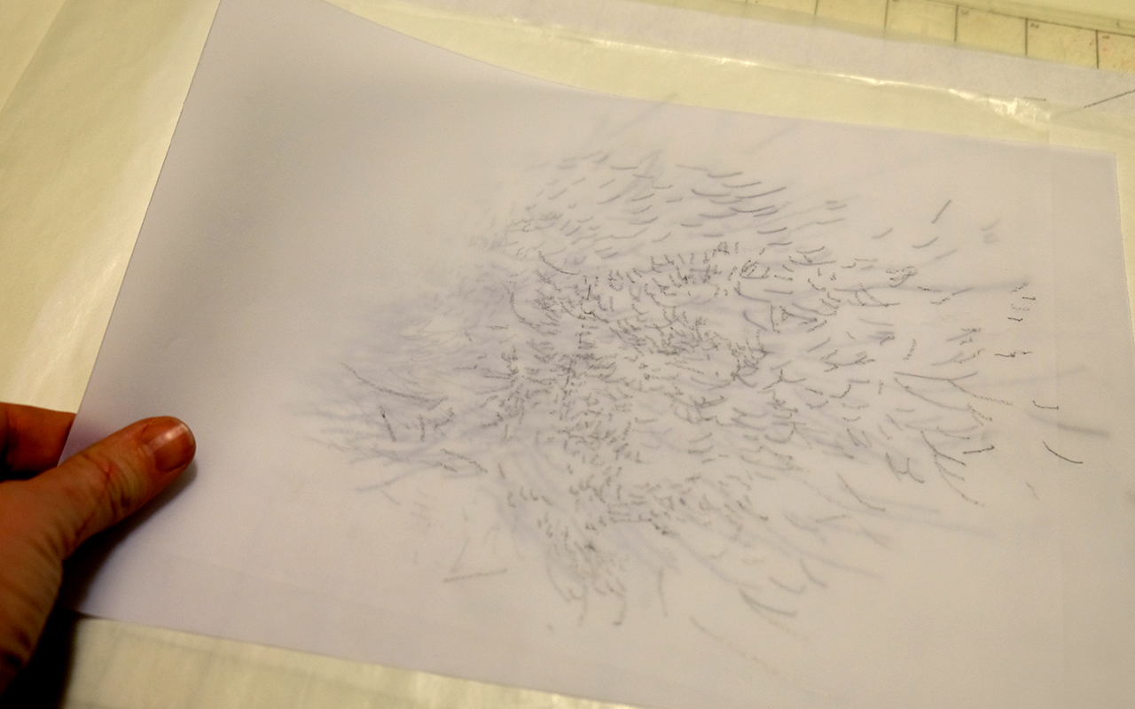 Diferentes tipos de papéis translúcidos foram testados. Procurou-se obter a melhor efeito de profundidade com o papel que fosse mais orgânico em sua textura, de modo a lembrar um céu.