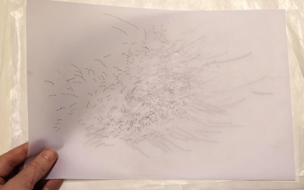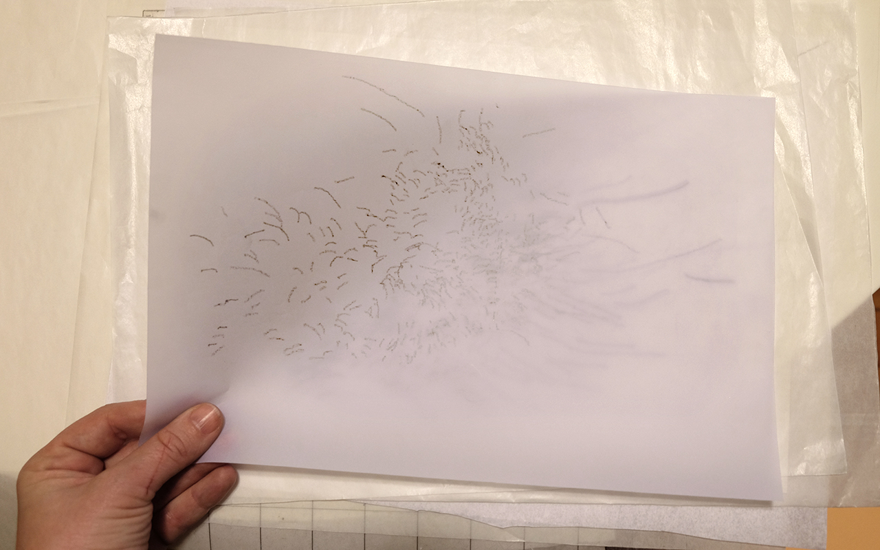 Até o momento foram realizadas provas de impressão com desenhos provisórios, vetores de movimentação pássaros a partir de frames de um vídeo, afim de testar o desenho impresso e efeito de sobreposição.